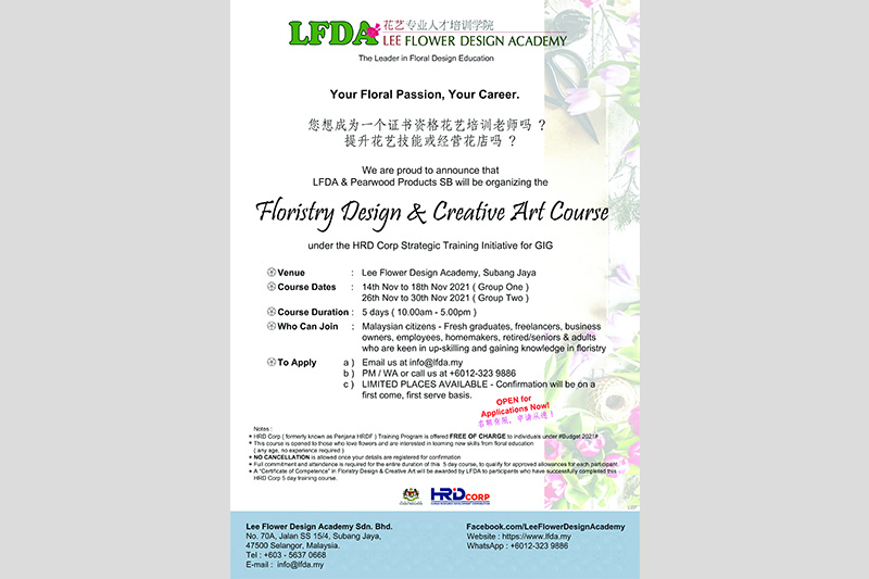 Floral classes are conducted in English, Mandarin, Cantonese and Bahasa Malaysia.